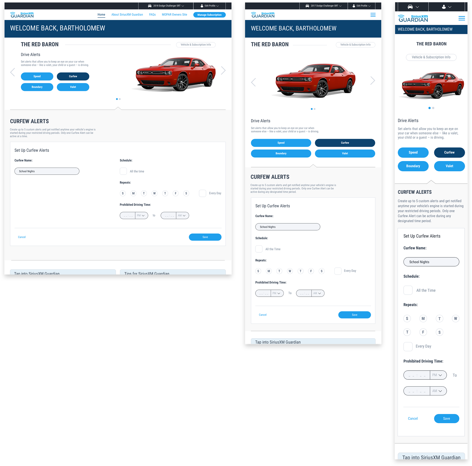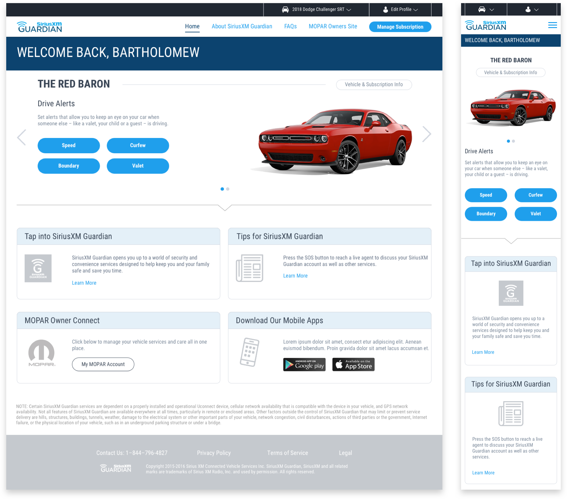 I worked with the team to bring additional value to the web portal via benefit-focused content. We designed the portal to make sure that the Drive Alert features are straight-forward to use. The goal here is to quickly set up alerts so the user can monitor if the driver is speeding, using the vehicle when not allowed, entering or exiting specific areas, or driving outside the valet radius. The web portal can also be used to edit user profile, and manage subscription packages.