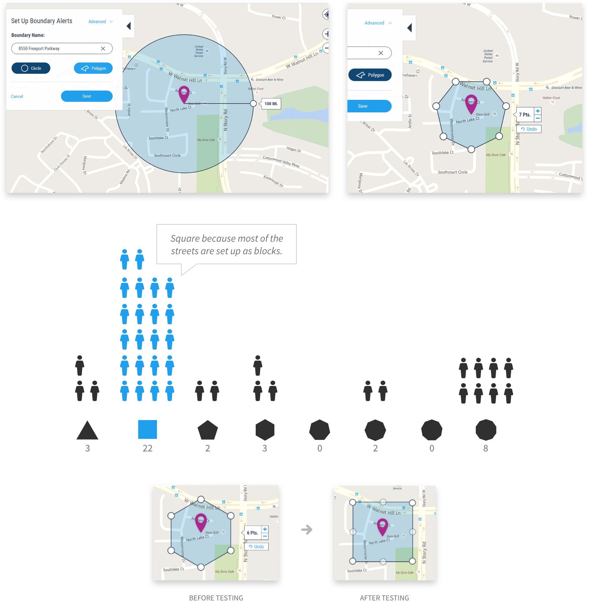 In order to get a better understanding of how to design the polygon feature, I set up a test in usertesting.com to learn how a customer might use this to set up a boundary. This test enabled us to create a simple polygon design with initial four sides, which can be adjusted to maximum of eight sides for more complex areas.
