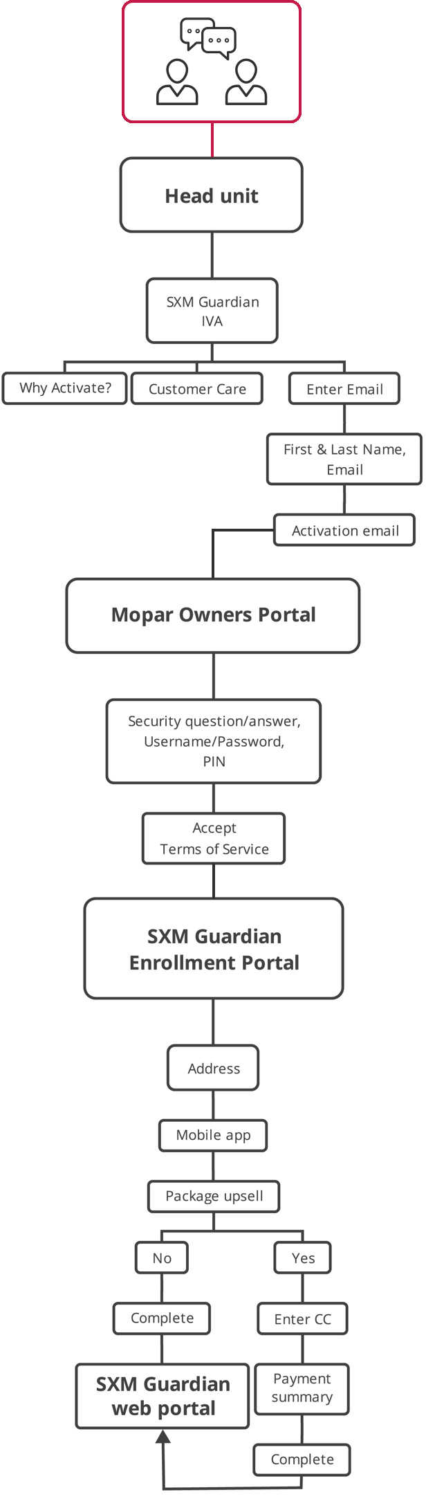 SiriusXM Guardian is responsible for the entire acquisition process that starts at the head unit and ends in the web portal. It's important to know that the first step in discovering what SXM Guardian is, and learning about its connected vehicle services happen during the conversation that takes place between the customer and the dealer. This is reinforced in the vehicle's head unit via the In-Vehicle App (IVA) where the customer can learn more and enroll in trial membership.
