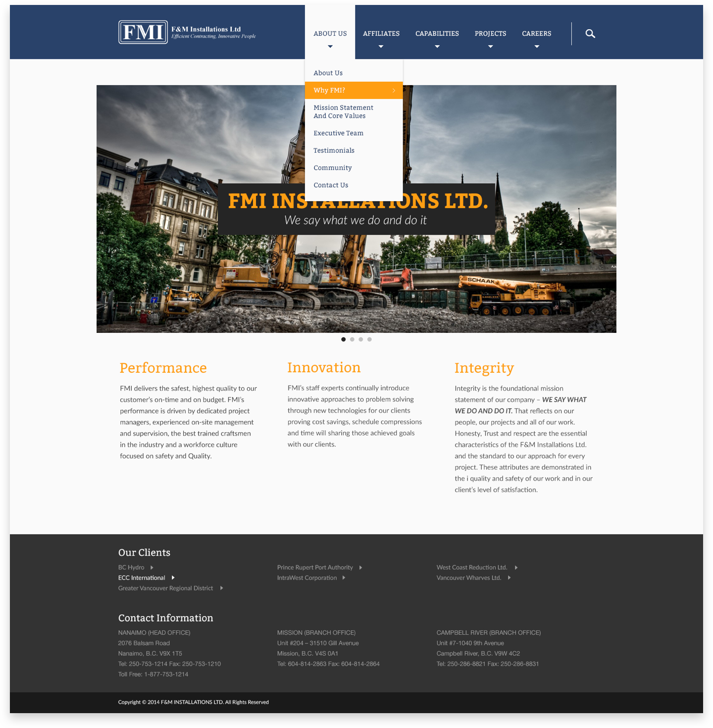 FMI Installations, was in a need of a new company website to help attract more clients, generate new business, and showcase their services. While working at Dumbwaiter, a digital agency based in Rochester, NY, I was responsible for working with the client in order to deliver an updated website.